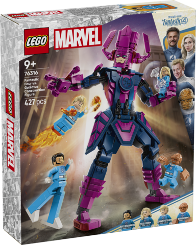 Fans of Marvel Studios’ The Fantastic Four: First Steps can recreate the movie’s action with LEGO® ǀ Marvel Fantastic Four vs. Galactus Construction Figure (76316), the first ever LEGO Fantastic Four set! This impressive gift for boys and girls aged 9 plus is a build-and-play LEGO ǀ Marvel set for kids who love Super Hero adventures. The buildable LEGO ǀ Marvel Fantastic Four toy includes 4 minifigures: Mr. Fantastic, featuring extendable legs; Human Torch, with 2 hand blasters and flame elements attached to his feet, plus a transparent support that enables him to ‘fly’; Invisible Woman holding 2 force shields; and The Thing with his large, powerful hands. A fully jointed construction figure of the movie’s iconic villain, Galactus, stands over 11 in. (28 cm) tall. This posable construction figure prompts endless action as he battles the Super Heroes. For added digital fun, builders can zoom in, rotate models in 3D and track progress using the fun, intuitive LEGO Builder app. Set contains 427 pieces.