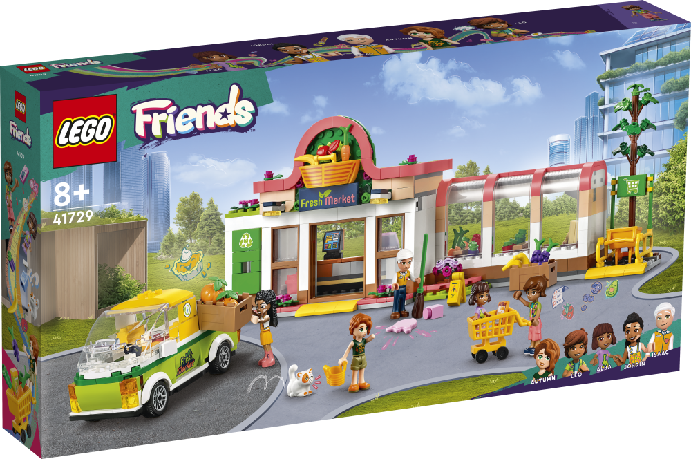 Includes 4 mini-dolls The toy grocery store comes with LEGO® Friends mini-dolls Leo Autumn Jordin and Isaac plus a younger sister Alba and Churro the cat characters